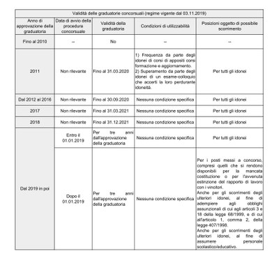 La tabella con la validità della graduatorie