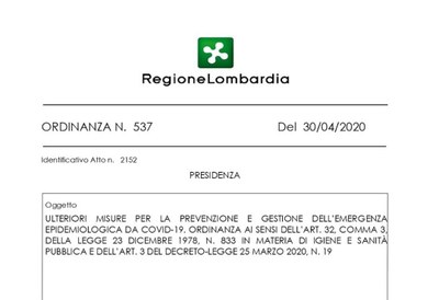 Regione Lombardia ha emanato l'Ordinanza 537 del 30 aprile 2020 che contiene misure per prevenire e gestire l'emergenza epidemiologica da Covid-19, in vigore dal 4 maggio al 17 maggio 2020.