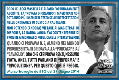 Anche ieri, come ogni giorno, Repubblica ci ha anticipato la quotidiana Grande Riforma che presto, prestissimo, quanto prima, il Pie’ Veloce Matteo ci regalerà. Dopo quelle della Costituzione, della legge elettorale, del fisco, del lavoro, dell’ozio, della burocrazia, della scuola, dell’università, dell’asilo, dell’agricoltura, dell’artigianato, del commercio, della pastorizia, della caccia, della pesca, dell’apicoltura, della mitilicoltura, delle carceri e dei circhi equestri (per fortuna mai viste se non in qualche slide), è in arrivo una nuova mirabolante Rivoluzione: quella della Giustizia, civile e pure penale. Rassicuriamo subito i lettori: le probabilità che la Palingenesi veda un giorno la luce sono pari a zero. Sia perché i neoriformatori non son buoni neppure a legarsi le scarpe. Sia perché in Parlamento una maggioranza che voti i brevi cenni sull’universo del ministro Orlando, non c’è. O meglio: ci sarebbe se il Pd facesse ciò che dice, nel qual caso potrebbe trovare sponde robuste nei 5Stelle e in quel che resta di Sel (ma così crollerebbe il governo, sostenuto ufficialmente da Ncd e centrini vari, e ufficiosamente da FI). Ma il partito dell’impunità è ancora ben saldo anche nel Pd, come dimostrano il voto sulla responsabilità civile diretta delle toghe e l’immunità ai senatori non più eletti. Dunque la fine del pacchetto Orlando (semprechè sia il suo, viste le smentite di ieri) è già nota: le buone intenzioni (falso in bilancio, autoriciclaggio, blocco della prescrizione dopo la sentenza di primo grado) imboccheranno il solito binario morto, e viaggeranno col turbo solo quelle pessime, che piacciono un sacco a Ncd, centrini, FI, del cui sacco sono infatti farina: il solito bavaglio sulle intercettazioni e il dirottamento del giudizio disciplinare sui magistrati dal Csm verso un’“Alta Corte” (idea di Violante, cioè del centrodestra), ovvero a un plotone d’esecuzione infarcito di politicanti. Le intercettazioni sono la prima ossessione della Casta da almeno 10 anni: da quando, sterilizzati i pentiti e tolto il valore di prova delle chiamate in correità, gli scandali escono direttamente dalle boccucce ciarliere di lorsignori. Spesso l’intercettazione è un selfie: ritrae il criminale nell’atto di delinquere; e le chiacchiere su complotti, toghe rosse, garantismo e giustizialismo stanno a zero. Non potendo (ancora) vietare ai magistrati di disporle, la Banda Larga s’accontenterebbe di proibire ai giornali di pubblicare le intercettazioni, rinviando alla fine del processo il momento della divulgazione: quando ormai nessuno si ricorda più nulla.