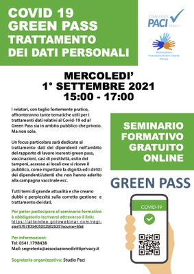 01/09/2021 - Covid 19 - Green Pass e trattamento dei dati personali - Seminario formativo gratuito Mercoledì 1° Settembre 2021 - Ore 15,00 - 17,00
