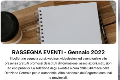 È disponibile la nuova Rassegna eventi GENNAIO 2022curata dalla Biblioteca della Direzione Centrale per le Autonomie. Albo nazionale dei Segretari comunali e provinciali.